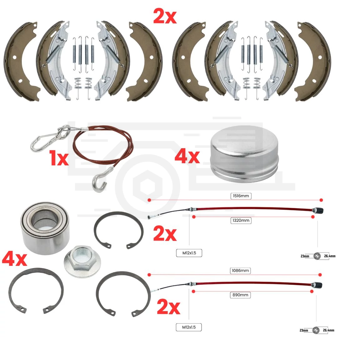 Ez a fékfelújító szett mindent tartalmaz, amire szüksége van egy 2 tengelyes utánfutó fékrendszerének teljes felújításához. A csomag része: