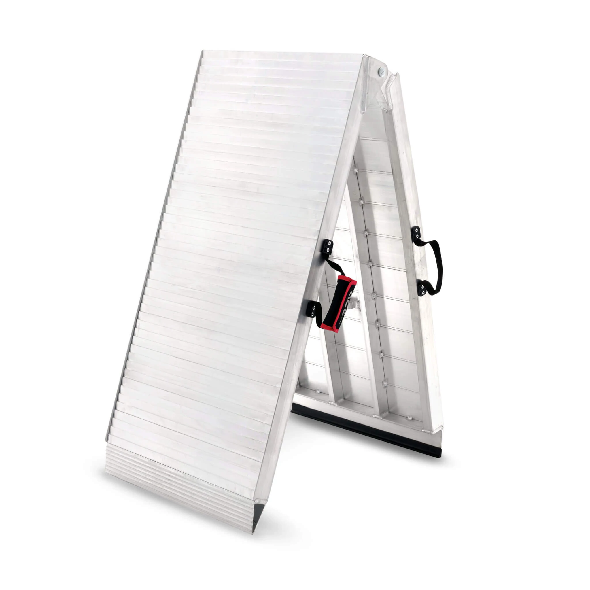 Ez a prémium, extra széles rámpa különleges kialakításának köszönhetően lehetővé teszi, hogy motorját biztonságosan és egyszerűen tárolhassa. A rendkívül masszív, de mégis könnyű, teljes egészében alumíniumból készült rámpa 500 kg-ig terhelhető, így minden típusú motorkerékpárhoz ideális. A 57 cm-es extra szélesség kényelmes hozzáférést biztosít a rámpán való fel- és lehajtáshoz. A mindössze 16,5 kg súlyú rámpa praktikus, könnyen szállítható, és egy hasznos fogantyúval is felszerelt a könnyű kezelhetőség és tárolás érdekében. Teljesen zárt felülete extra tapadást és tartósságot biztosít. A maximális biztonság érdekében a rámpához biztonsági hevederek is tartoznak, amelyek megakadályozzák az elmozdulást.