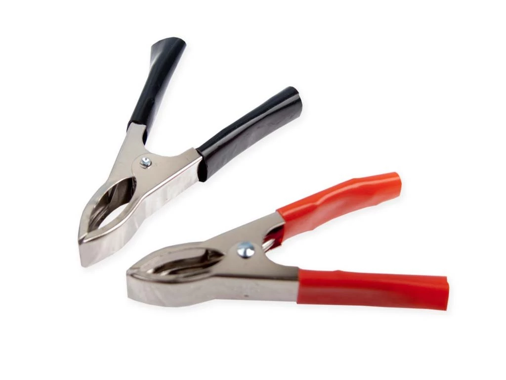 Krokodil csipesz akkumulátor töltőhöz, 30 A. A szett 2 db csipeszt tartalmaz (piros és fekete). Méret kb. 9 cm.