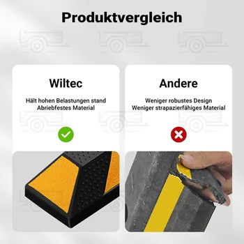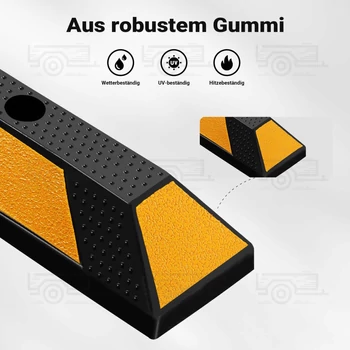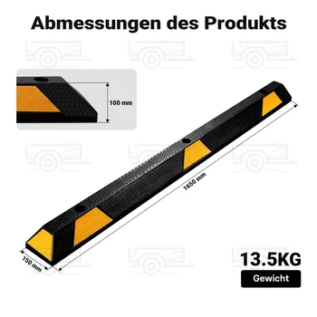 Méretek: 1650 x 150 x 100 mm Ez a kerékütköző ideális megoldás garázsokban vagy parkolókban történő használatra. A 165 x 15 x 10 cm méretű ütköző sárga fényvisszaverő csíkkal rendelkezik, biztosítva a jó láthatóságot, és csavarhelyekkel, amelyek megkönnyítik a rögzítést. |