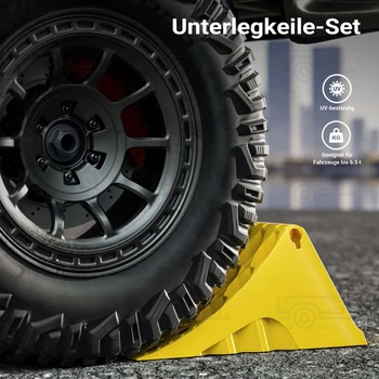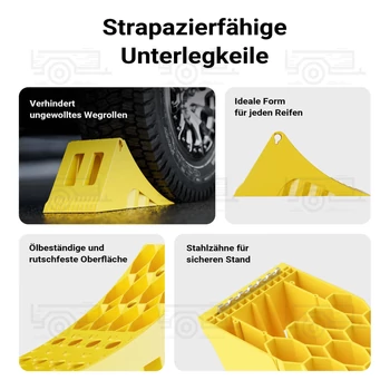 Teherautókhoz, személyautókhoz, haszongépjárművekhez és lakóautókhoz készült kerékékek, amelyek párban 6,5 tonna teherbírással rendelkeznek, maximális biztonságot és stabilitást nyújtva. Robusztus HDPE műanyagból készültek, csúszásmentes talppal és fémlemezzel az alján, amely biztosítja a jármű stabil rögzítését. |