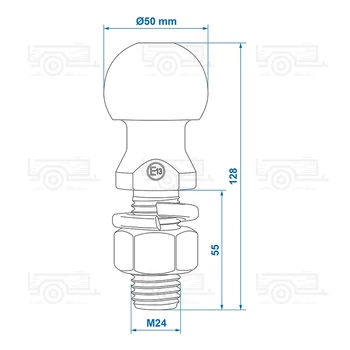 M24 x 55 mm menettel rendelkező Ø50 mm átmérőjű vonóhorog gömbfej. E-jelöléssel (R55) engedélyezett közúti használatra. Maximális terhelhetőség: 2000 kg, D-érték: 9,81 kN, S-érték: 200 kg.