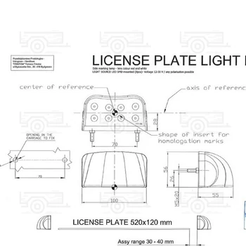 FT-026 LED rendszám világítás, 1-funkciós lámpa. Európai homologizáció: E9. Feszültségtartomány: 12 - 36 V DC. Időjárásálló, áramfelvétel: 12 V / 24 V = 0,08 / 0,08 A. Energiafogyasztás: 12V / 24V = 1W / 2W. Kábel gyorscsatlakozóval QS075. Méretek: 100 x 50 mm, furattávolság: 70 mm. |