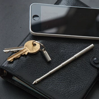 • különleges, teleszkópos kialakítás • szálcsiszolt rozsdamentes acél teleszkópos test • akumínium ház • tartozék 3 tollbetét • mágneses vég • méret összetolva, kupakkal, kulcskarika nélkül • csupán ∅0,7 x 6 cm |