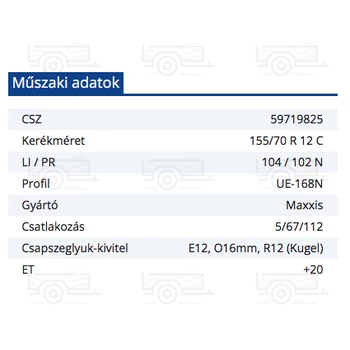RAD 155 / 70 R 12 C UE-168N MAXXIS 104 / 102 N, TL, 5/67/112, E12, O16MM, R12, ET +20 4.5 X 12, RAL9006 SILBER
