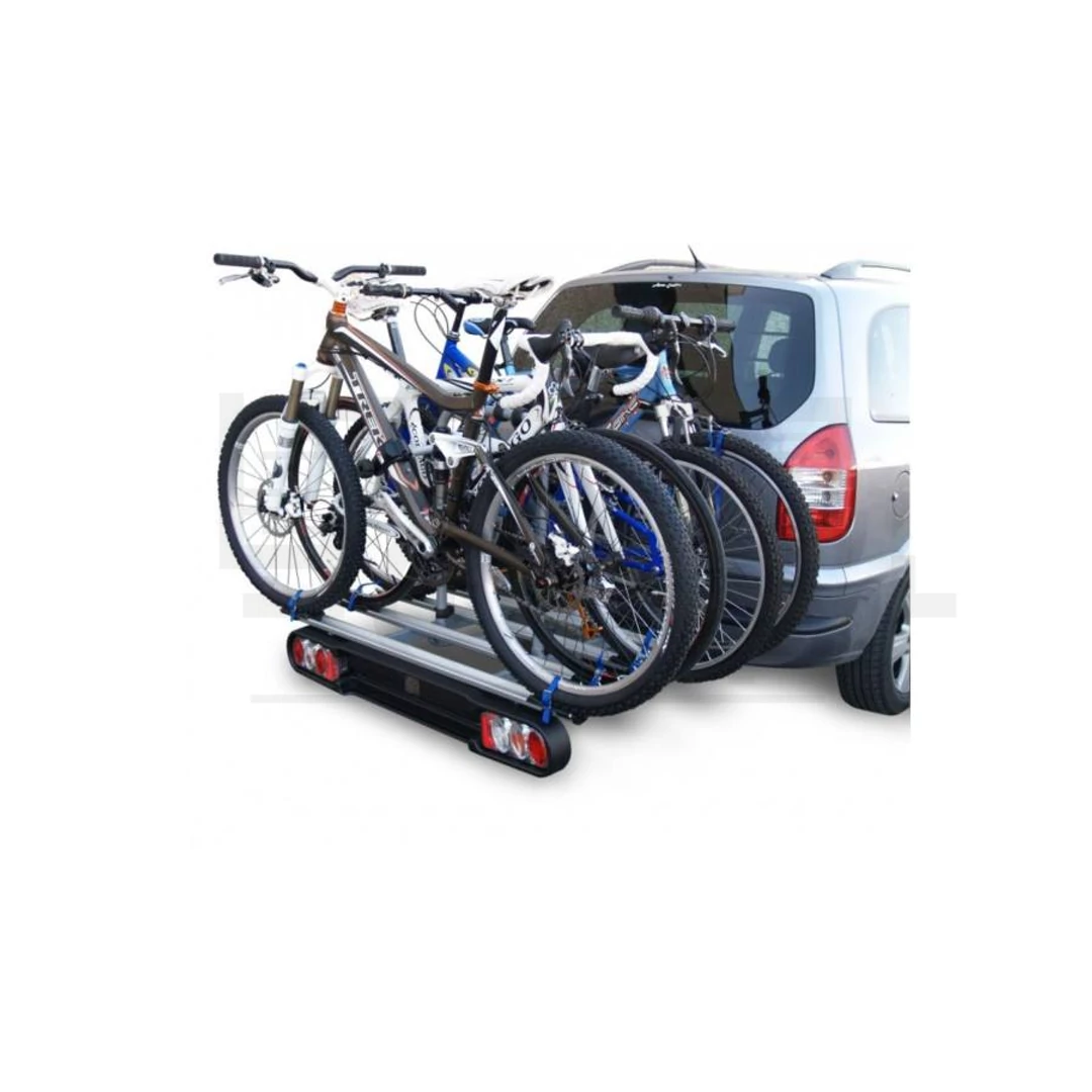 MENABO RACE 3 kerékpártartó, kerékpárszállító vonóhorogra Vonóhorogra szerelhető kerékpártartó, kerékpárszállító 3 db kerékpár biztonságos szállítására alkalmas. Az összes szabvány vonóhorogra felszerelhető. A vonóhorogra szerelhető kerékpárszállító az egyik legkényelmesebben rakodható, legnagyobb biztonságot nyújtó szállító fajta. Mivel a sínek alacsonyan vannak, így azok is könnyedén feltehetik a bringáikat, akiknek a tetőre rakodás gondot okozott. Speciálisan profilozott alumínium sínjein a keréktámasz állítható, így bármilyen tengelytávolsághoz alkalmas (pl gyerekbringák.) A kerékpárvázakat stabil tartókarok fogják, így a kerékpárok nem érintkeznek, nem verődnek egymáshoz, ezzel is megóvva azok állapotát és fényezését. A karokhoz tartozék egy hosszabb csavar, aminek alkalmazásával az extrém formájú vagy méretű vázcsövek is megfoghatók. Elektromos csatlakozója 13 pólusú, de a tartozék adapter segítségével a hét pólusú rendszerekkel is kompatibilis. Tulajdonságok: 3 db kerékpár szállítására alkalmas 3 db vázfogó karommal a kerékpárok precíz rögzítéséhez Acél, alu sínnel Max. 45 kg-ig terhelhető