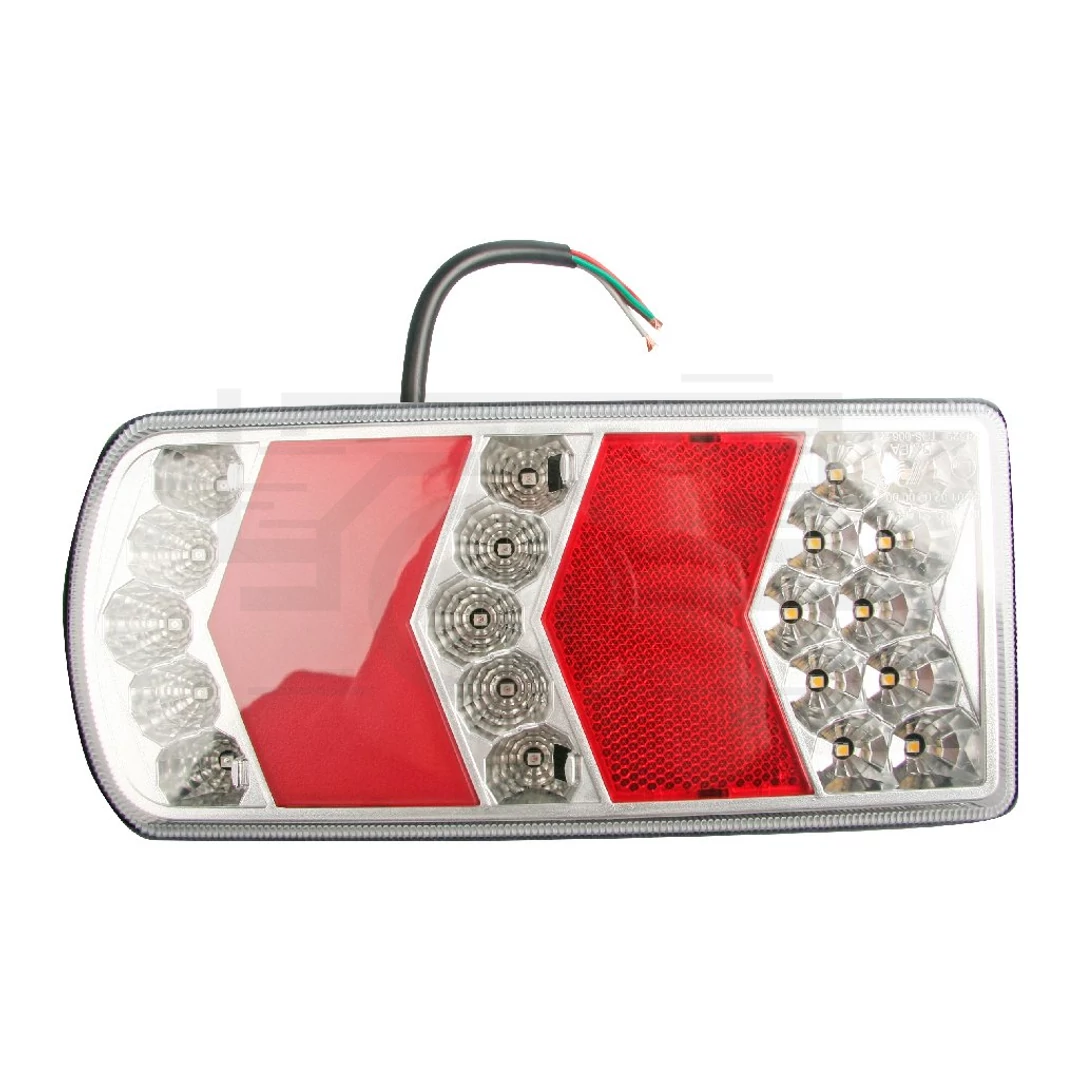 Ez az egyesített jobb hátsó LED lámpa 5 funkcióval rendelkezik: helyzetjelző (6 dióda / 1.6 W), irányjelző (5 dióda / 1.2 W), féklámpa (5 dióda / 1.2 W), rendszám világítás (3 dióda / 0,8 W) és tolatólámpa (10 dióda / 1.2 W). Az IP67-es védettségi osztály garantálja a por- és vízállóságot, így kültéri használatra is ideális. A lámpa 12-24 V feszültséggel működik és E4 homologációval rendelkezik, megfelelve az európai közúti közlekedési előírásoknak. A lámpa méretei: 228 x 106 x 40 mm, a rögzítéshez szükséges furattávolság 150 mm. A bekötéshez szükséges kábelek színei: helyzetjelző + rendszám világítás, irányjelző és féklámpa. Kiváló választás utánfutók, járművek és egyéb közlekedési eszközök számára, amelyeknek szükségük van megbízható és jól látható világításra.