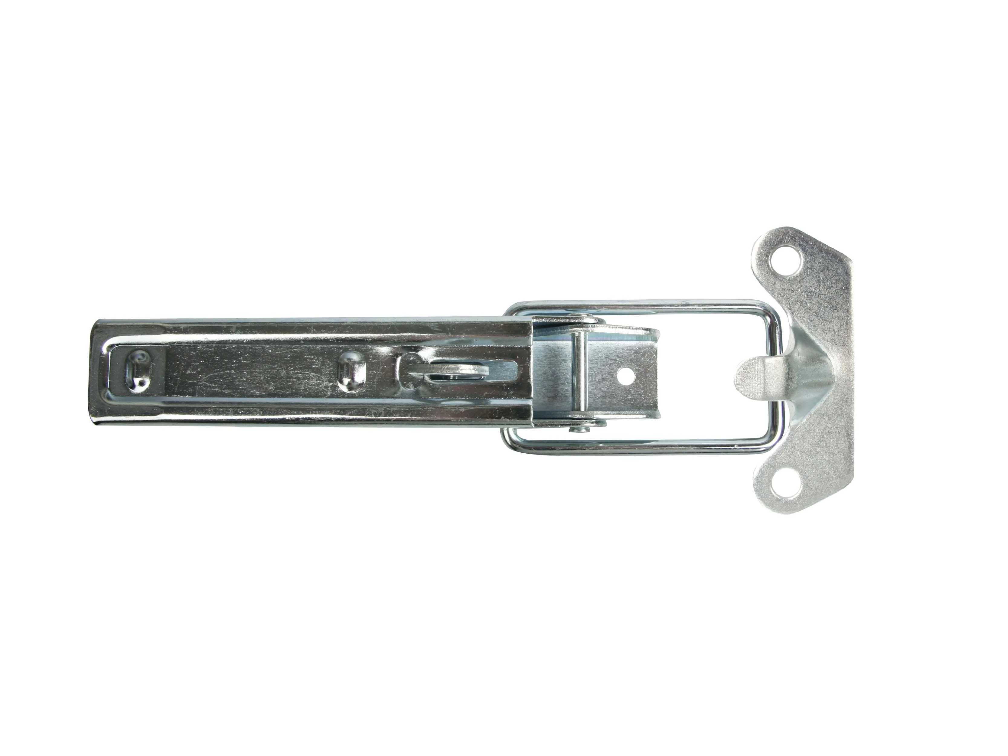 Praktikus békazár szett. Racsnis részt és ellendarabot is tartalmaz, ami a hátfalat tartja. A tömör fogantyú profilos fogantyúval és reteszelő füllel megakadályozza az oldal- vagy a hátfal akaratlan kinyílását. A rögzítő részt biztosítócsappal vagy egy kis zárral lehet rögzíteni (nem része a terméknek).